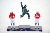 Lucas Pinheiro Braathen of Team Brazil jumps for joy on the Olympic podium.