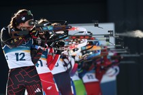 Biathletes stand side by side during a shooting bout.
