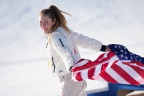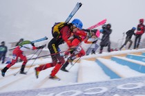Ski-mountaineering competitors sprint up the side of a mountain.