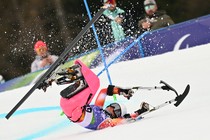 A para Alpine skier on a fast run crashes while trying for her third gold medal.