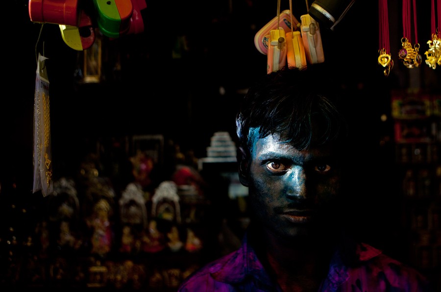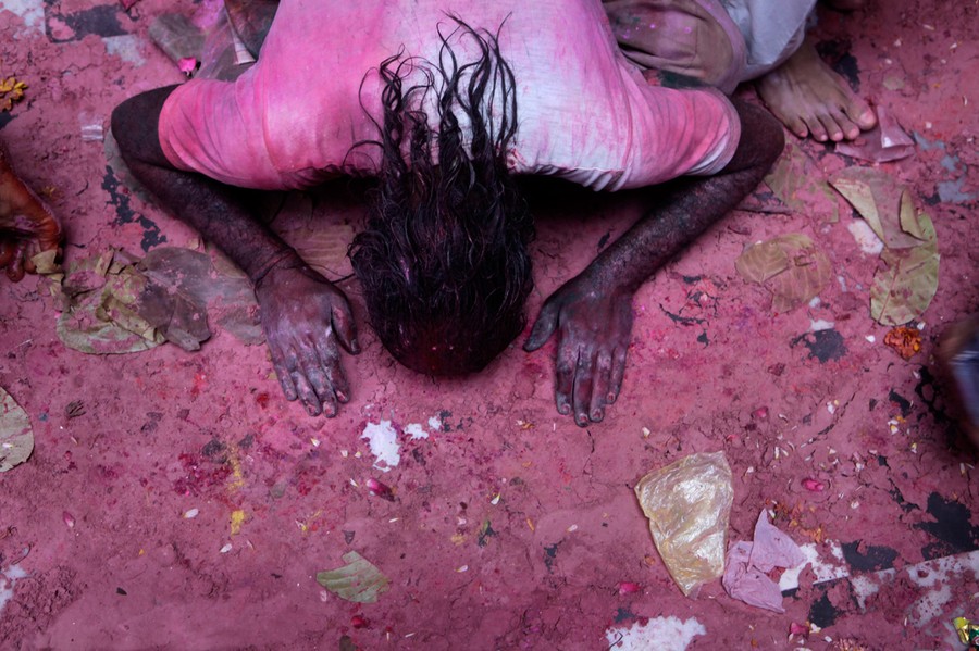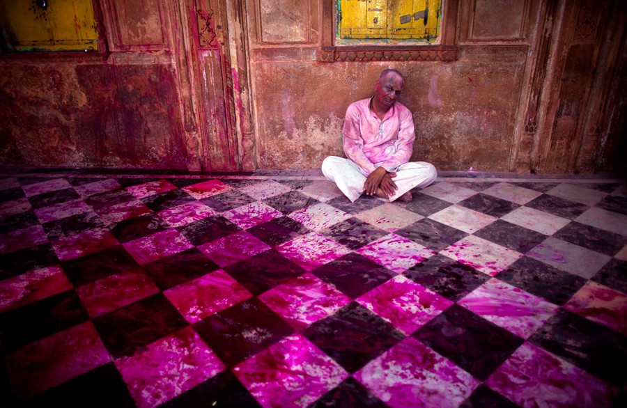 Read moreA Hindu devotee colored by powder thrown while celebrating Holi, the festival of color, looks on at the Banke Bihari temple in Vrindavan, India, Saturday, March 19, 2011. #
