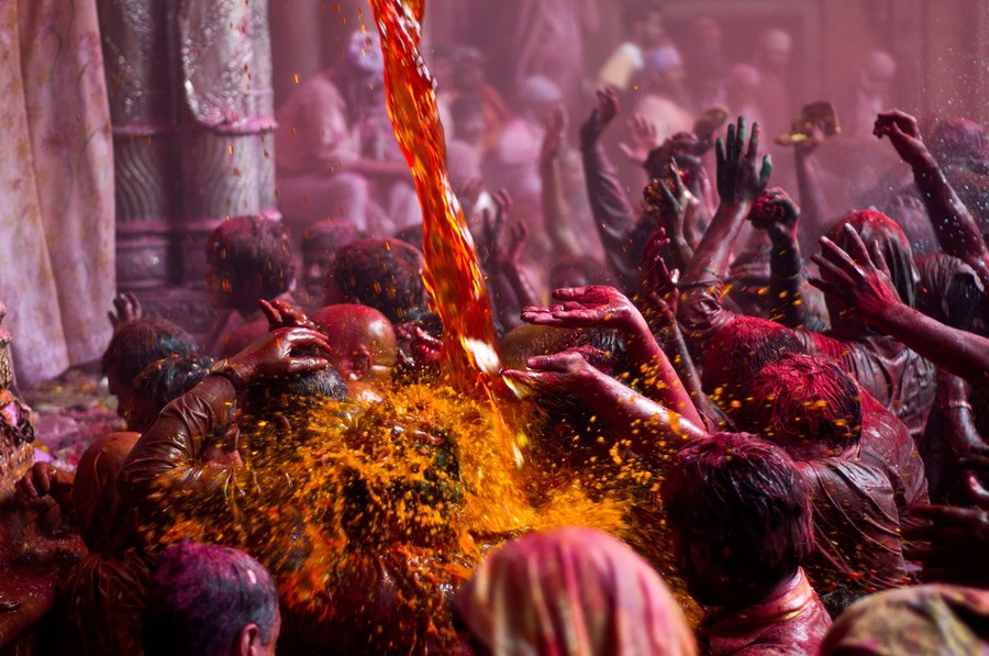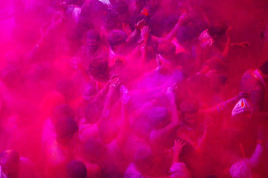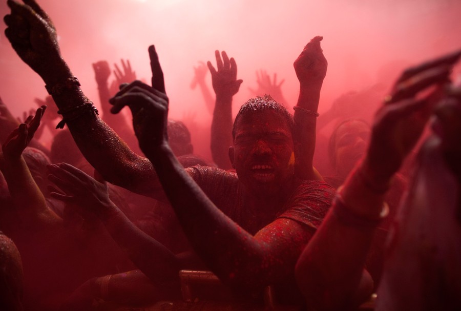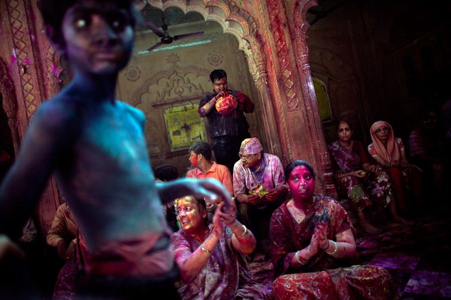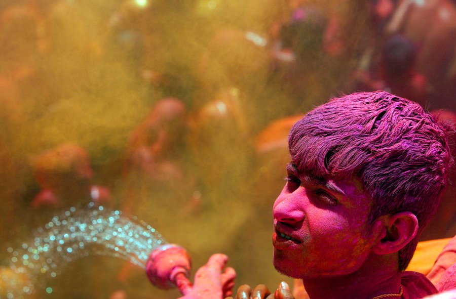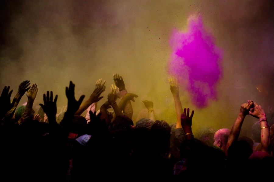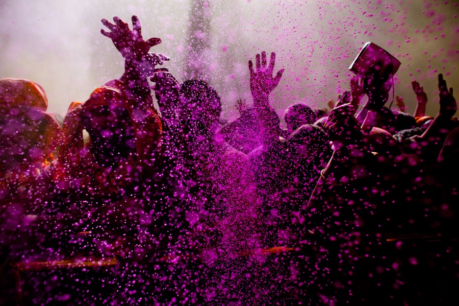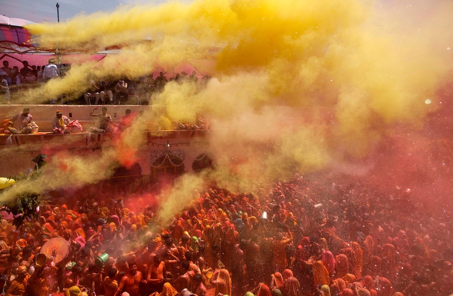 Read moreA puff of purple powder joins the clouds of other colored powders as Hindu devotees celebrate Holi at the Bankey Bihari Temple in Vrindavan, India on March 21, 2011. #