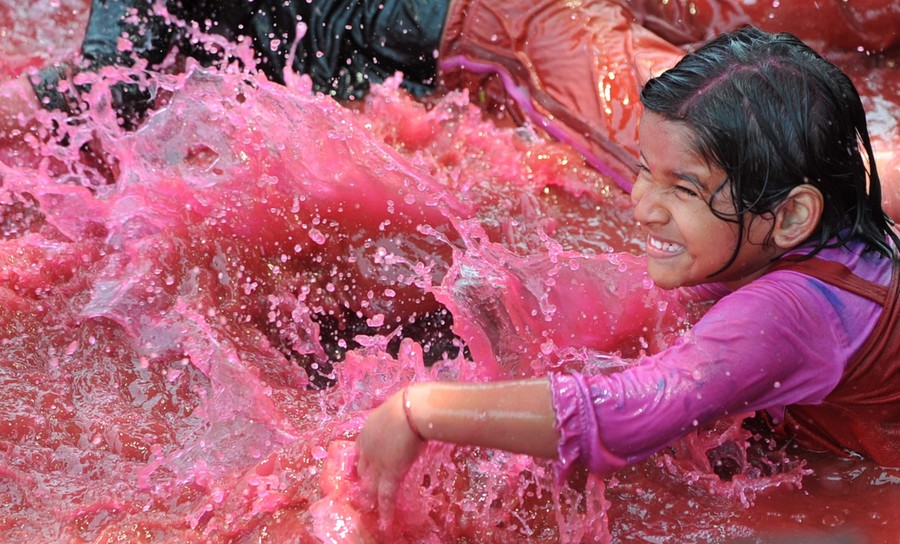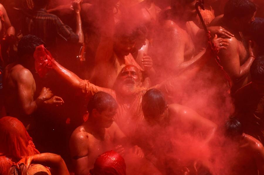 Read moreIndian Hindu worshipers are covered in red dye during Holi celebrations at the Dauji Temple in Dauji, India on Monday, March 21, 2011. The Dauji Temple festivities are known for a ritual where the women playfully hit men with whips made of cloth as men throw buckets of water with orange dye. #