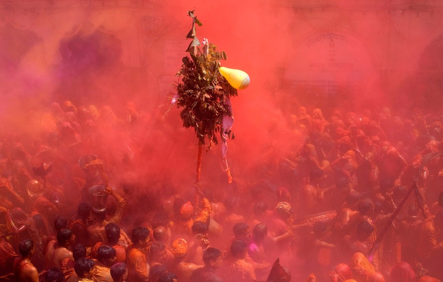 Read moreRed dye is thrown in the air as Indian Hindu worshipers, some carrying tree branches, take part in Holi celebrations, the Hindu festival of colors at the Dauji Temple in Dauji, India on Monday, March 21, 2011. #