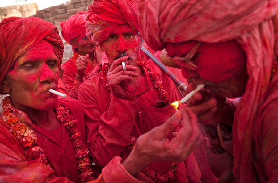 Read moreIndian villagers are covered in colorful dye as they chat during Holi celebrations in the village of Jaav, 120 km (113 mi) south of New Delhi, India on Monday, March 21, 2011. #