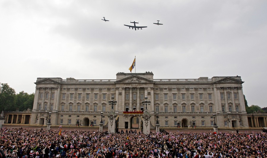 Read moreBritain's Queen Elizabeth and Prince Philip return to Buckingham Palace along the procession route in a Semi-State Landau after the wedding of Prince William and Kate Middleton at Westminster Abbey on April 29, 2011. #