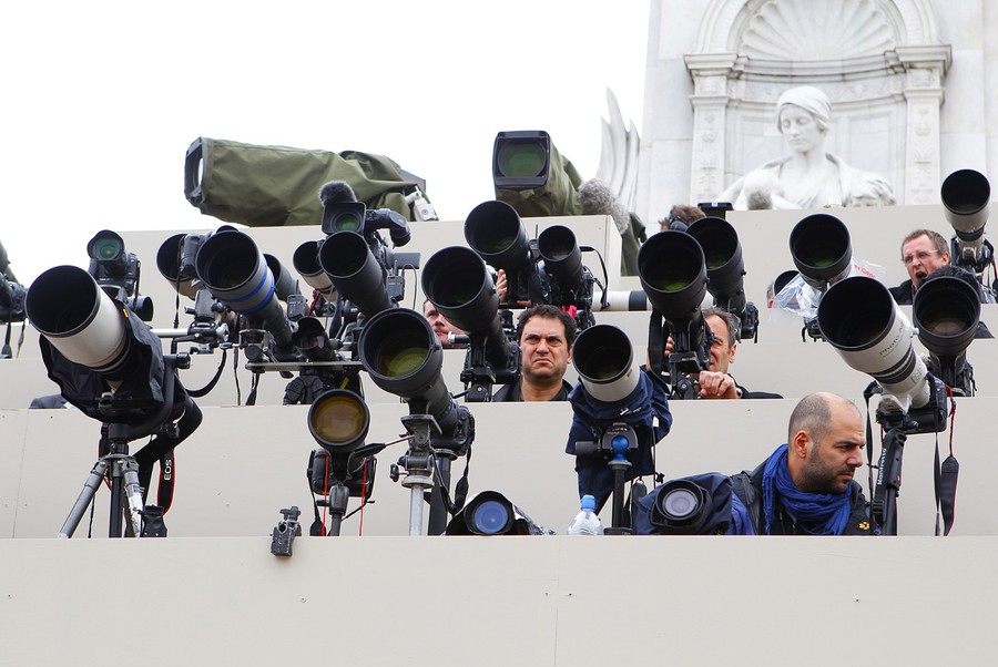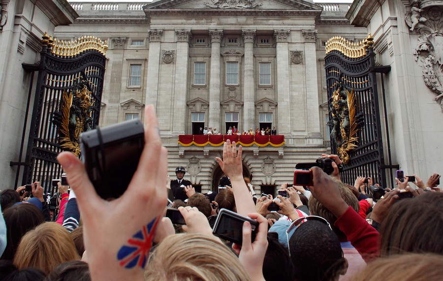 Read moreMembers of the media gather by the Queen Victoria memorial and point their lenses towards Buckingham Palace on April 29, 2011, the morning of Prince William's marriage to Kate Middleton. #