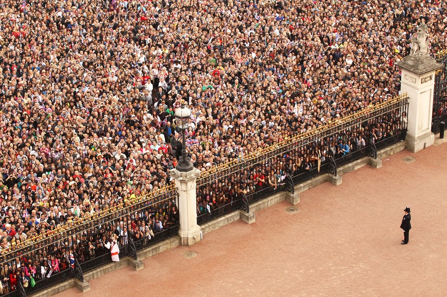 Read moreWell wishers crowd outside the gates of Buckingham Palace in front of the Victoria Memorial as they celebrate the royal wedding of Prince William, Duke of Cambridge, and Catherine, Duchess of Cambridge, on April 29, 2011. #
