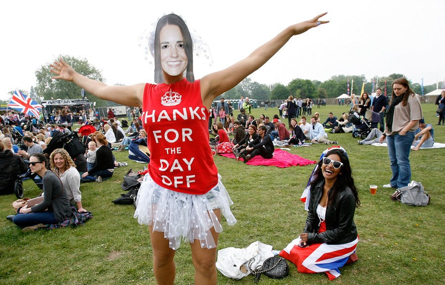 Read moreMaria Guerrero, wearing a face mask of Kate Middleton, dances on April 29, 2011, as she watches the royal wedding on a big screen in Clapham Common, an open space in South London that has been largely turned into a campsite to accommodate revelers for three nights. #