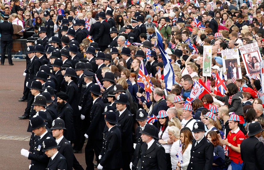 Read morePolice officers line up in front of the crowds as they wait for Britain's Prince William and his wife Catherine, Duchess of Cambridge, to appear on the balcony of Buckingham Palace after their wedding on April 29, 2011. #