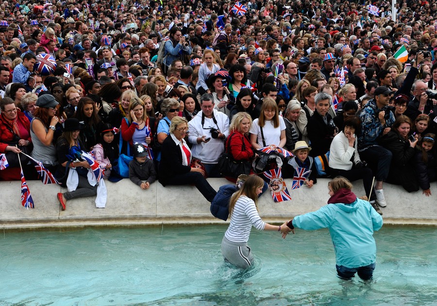 Read moreRoyal supporters in central London play in the water along the processional route on April 29, 2011, the wedding day of Britain's Prince William and Kate, Duchess of Cambridge. #