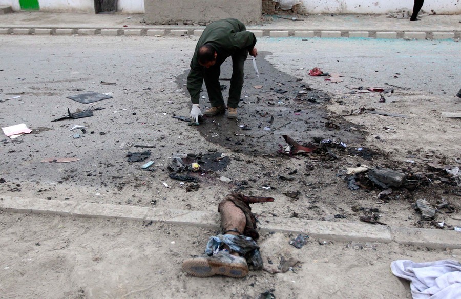Click to view imageRead moreThe dismembered leg of a suicide bomber lies near an Afghan investigator as he inspects the site of a suicide attack in Kabul April 9, 2011. The bomber attacked an Afghan army bus on the outskirts of Kabul on Saturday, wounding up to 10 soldiers and civilians, less than a week after a suicide attack on a foreign military base in the city, a police spokesman said. #
