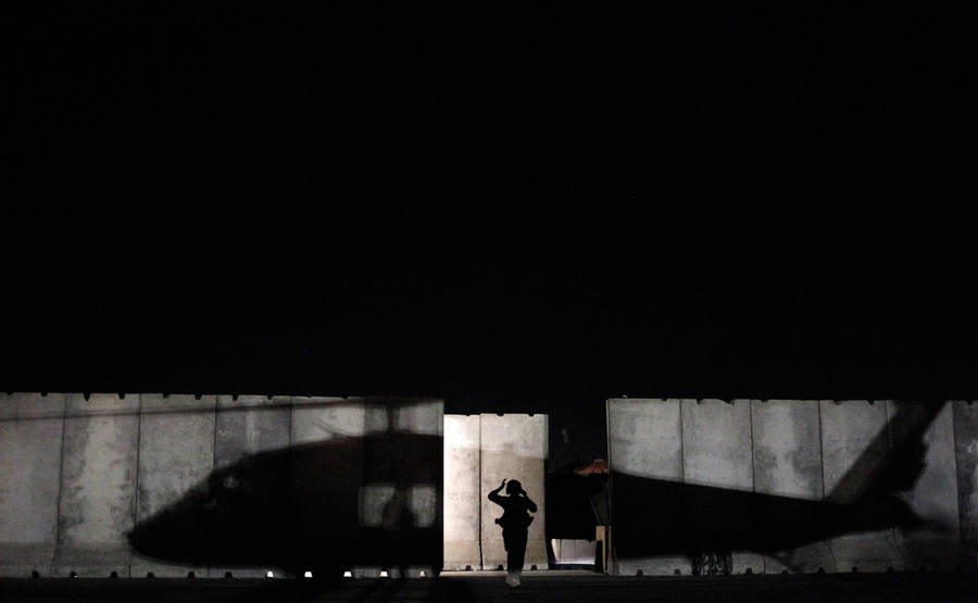 Read moreU.S. Army medic SSG Quincy Northern from "Dustoff" team, C Company, 1-214 Aviation Regiment, 101st Combat Aviation Brigade walks toward his medevac helicopter as it casts a shadow on a hospital wall at Camp Dwyer in Helmand Province, Afghanistan, on April 5, 2011. #