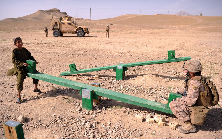Read moreCaptain Elizabeth Jackson from US 3rd Battalion 2nd Marine Regimental Combat Team 8 rides on a teeter-totter with an Afghan boy in a playground near the town of Musa Qala in Helmand Province, Afghanistan, on April 12, 2011. #