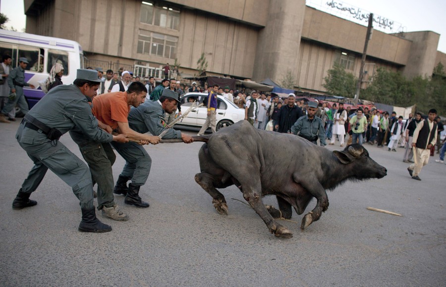 Read moreAfghan policemen tackle a bull that went out of control on April 30, 2011, in Kabul, Afghanistan. The uncontrollable bull injured five Afghans and charged at a cart loaded with sandals for sale in the center of Kabul before police shot the bull dead. #