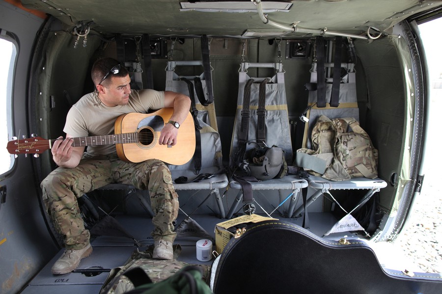 Read moreU.S. Army Sgt. Chris Sutton with Task Force Thunder Brigade, Charlie Company 1st of the 52nd Aviation Regiment from Fairbanks, Alaska, plays his guitar inside a Blackhawk UH-60A helicopter during some quiet time on April 24, 2011, at Camp Passab, Kandahar Province, Afghanistan. It is feared that as weather improves with the approaching summer that the casualty toll will rise. #