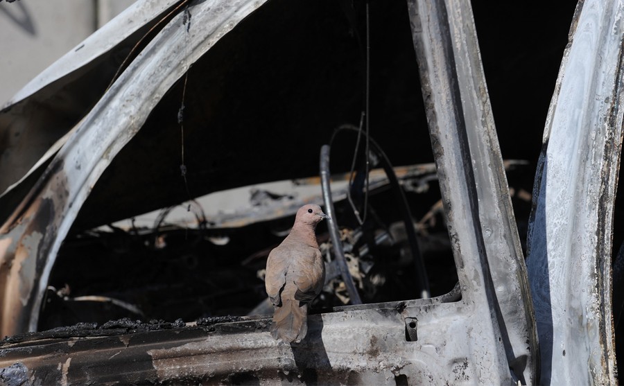 Read moreA dove sits on the wreckage of a burned-out vehicle at the UN headquarters in Mazar-i-Sharif on April 2, 2011, after protesters attacked the compound on April 1. A mob enraged by a Koran burning in the US killed seven staff, the worst attack on the UN in the country since the 2001 invasion. #