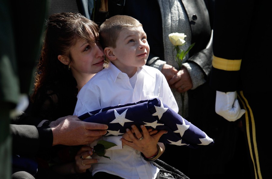 Read moreNikolous Poulin, 5, center, sits in the lap of his aunt Jennifer Poulin, both of Pawtucket, Rhode Island, while holding an American flag presented to him at the funeral of his father, National Guard Spc. Dennis Poulin, at Saint Ann's Cemetery, in Cranston, Rhode Island, on Thursday, April 14, 2011. Poulin died March 31, 2011 in Germany of injuries he received when his armored vehicle rolled over in Afghanistan. #