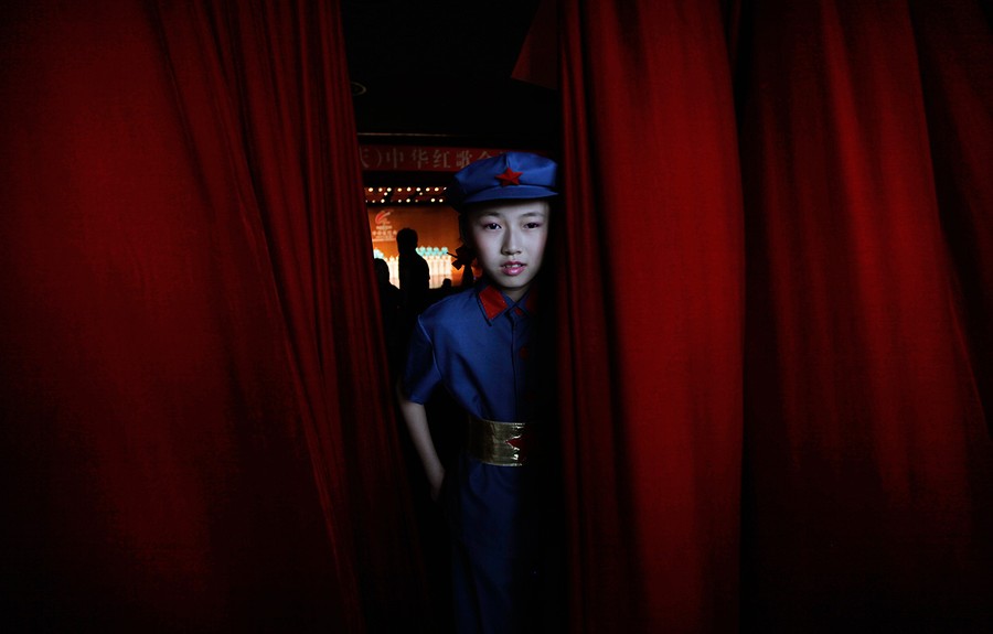 Read moreA schoolgirl dressed as a Chinese Red Army soldier walks through a red curtain during a revolutionary song singing competition in Chongqing municipality, on June 30, 2011. #