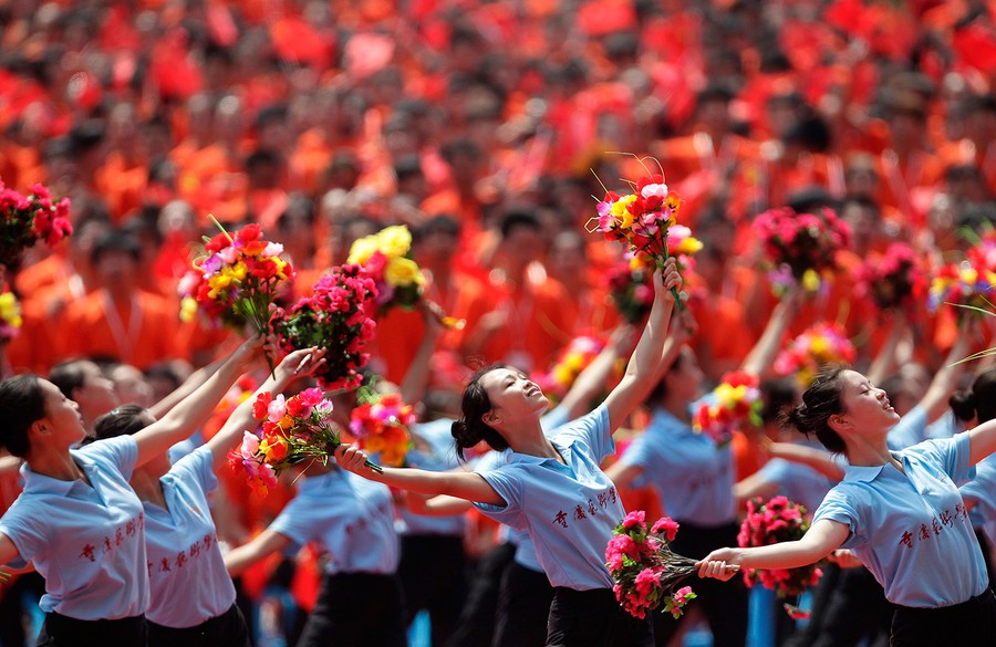 Read moreStudents wave the flags of Communist Party of China during the opening ceremony of a revolutionary song singing concert at Chongqing Olympic Sports Center, on June 29, 2011. More than 70,000 people attended the ceremony. #