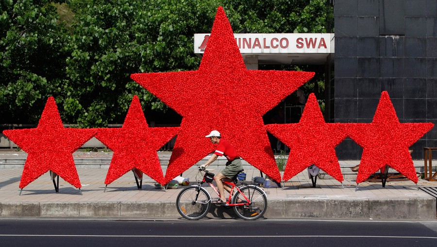 Read moreA man cycles past a decoration put up to celebrate the upcoming 90th anniversary of the founding of the Communist Party of China in Chongqing municipality, on June 30, 2011. #