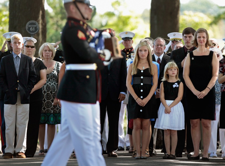 Read moreThe family of U.S. Marine Corps Lt. Col. Benjamin Palmer stand as the colonel's remains are carried to his burial ceremony at Arlington National Cemetery, on August 23, 2011 in Arlington, Virginia. Assigned to Marine Wing Headquarters Squadron 2, Palmer, 43, of Modesto, California, was fatally shot May 12 by a member of the paramilitary Afghan Civil Order Police Unit he was mentoring in Helmand Province. #