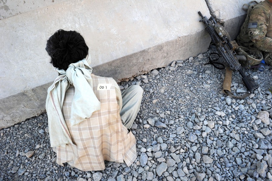 Read moreCaptured Taliban suspect identified as "detainee number 1" awaits interrogation on arrival at the Forward Operating Base Pasab in Zahri district, Kandahar province southern Afghanistan on August 15, 2011, following a five hour ground and air assault operation by US troops from Bravo and Delta company, 2-87 Infantry Battalion, 3rd Brigade Combat Team and Afghan national security forces in Maiwand district. #