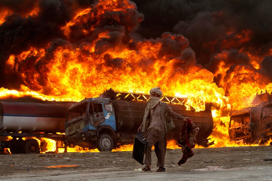 Read moreAn Afghan man carries his belongings as he passes burning fuel tankers in the outskirts of Kabul, Afghanistan, on August 4, 2011. Police said around five fuel tankers carrying fuel for NATO and U.S. forces in Afghanistan caught fire inside a depot in Kabul. #