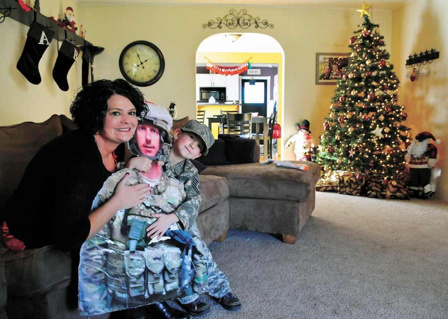 Read moreBrandy and Levi Hoyle hug a life-size cut-out photo of their husband and father Andy, in their Coquille, Oregon home, on December 23, 2011. Andy Hoyle is currently stationed in Afghanistan, and the photo they call "Flat Andy" travels around town with them wherever they go. Flat Andy has become well known in the Coquille area. #