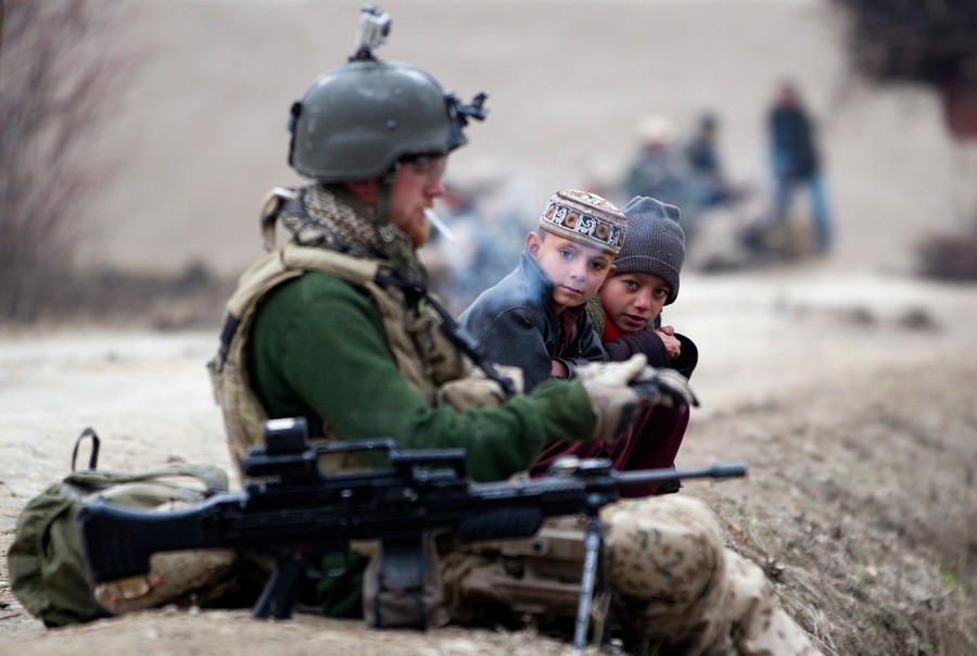 Read moreChildren look at a German soldier of the International Security Assistance Force (ISAF) as he smokes during a break while on a patrol in the village of Isa Khel in Chahar Dara district, on December 16, 2011. #