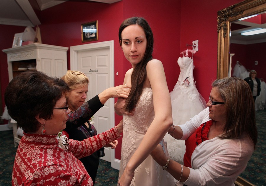 Read moreFrom left, Elaine Deamer, Jeanelle Costner, and Maritza Batallas help Ann Marie Toebes try on a dress during "Operation Wedding Gown" at Poffie Girls bridal boutique in Gastonia, North Carolina, on November 20, 2011. Toebes, from Cary, NC, is a medical student at the Univeristy of North Carolina and is engaged to U.S. Army Spc. Peter Richards who is currently deployed in Afghanistan. #