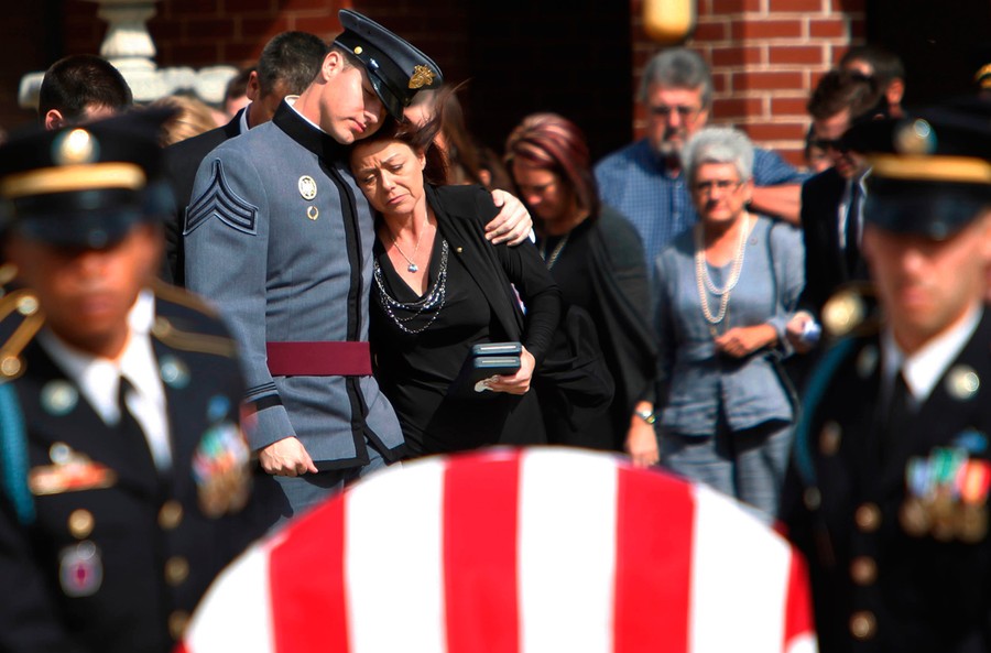 Read moreWest Point Cadet Lt. Michael Norris embraces his mother, Terri Norris, as they walk behind the remains of brother and son Army Pfc. Cody Norris, 20, upon the conclusion of the funeral service at First United Methodist Church in La Porte, Texas, on November 21, 2011. Army Pfc. Cody Norris died November 9 in Kandahar province in Afghanistan of wounds suffered when enemy forces attacked his unit with gunfire. It was his first deployment. #
