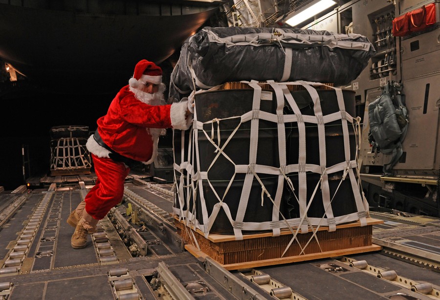 Read moreSanta Claus, portrayed by Tech. Sgt. Mike Morris, 816th Expeditionary Airlift Squadron Loadmaster Flight NCO in charge and native of Charleston, South Carolina, pushes a pallet of fuel onto a C-17 Globemaster III prior to a mission, on December 23, 2011. #