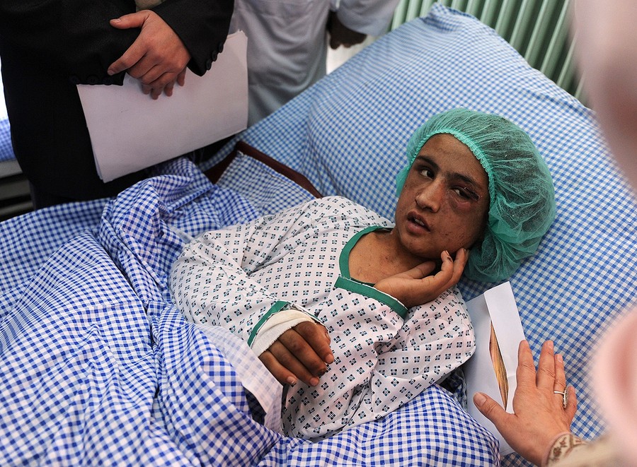 Read moreAfghan child bride Sahar Gul, 15, looks at Afghan Minister of Women's Affairs Husn Banu Ghazanfar (right) as she recovers at a hospital in Kabul, on December 31, 2011. Afghan police rescued the teenage girl who was beaten and locked up in a toilet for over five months after she defied her in-laws who tried to force her into prostitution, officials said on December 27. Sahar Gul was found in the basement of her husband's house in northeastern Baghlan province late on December 26, 2011, after her parents reported her disappearance to the police. #