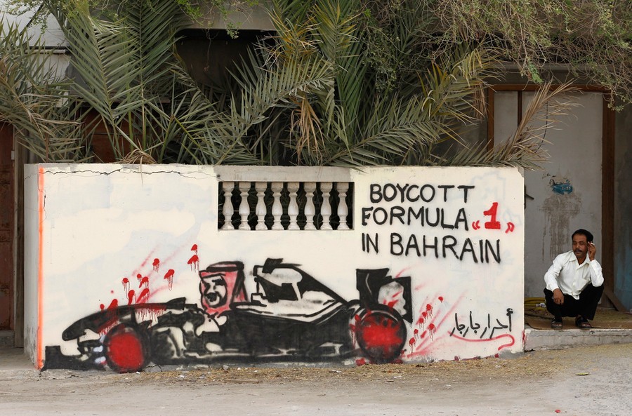 Read moreKaleem (@kaleemux) asked for an image of "The cultural contradiction of Formula 1. Especially relevant given last week's Bahrain fiasco." Very difficult image to find. Those that oppose or feel harmed by the F1 race in Bahrain are almost never seen in photos of the racers, cars, or audience. But the evidence of their unrest is visible. Here, a man smokes next to a wall with anti-Formula One graffiti in a village in Diraz, west of Manama early April 22, 2012. Formula One raced in Bahrain while rage boiled on the streets outside, among protesters who denounce the Grand Prix as a gaudy spectacle by a ruling family that crushed Arab Spring demonstrations last year. #