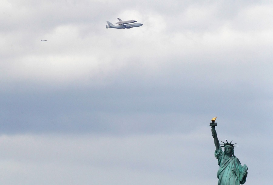 Read moreSunrise At The Sky (@SunriseAtTheSky) asked to see "Enterprise arriving in NY, for example with the Statue of Liberty." The Space Shuttles Enterprise rides atop a NASA modified 747 plane over the Statue of Liberty in New York April 27, 2012. The Space Shuttle Enterprise officially arrives in New York to be placed at the Intrepid Sea, Air and Space Museum. #