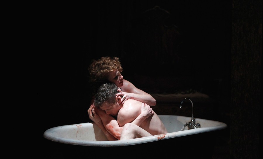 Read moreErin Elias (@eaelias) asked for "a photo from the immersive theater production 'Sleep No More'". Here, actors Eric Jackson Bradley and Tori Sparks perform the parts of Macbeth and Lady Macbeth in a production of "Sleep No More" in New York, on July 25, 2011. A haunted house, it's not. But for theatergoers including many high-profile celebrities hidden behind masks, "Sleep No More" certainly is haunting. Dubbed "immersive theater" by directors Felix Barrett and Maxine Doyle of British theater company Punchdrunk, the new show compels audience members to roam five floors and almost 100 rooms of the fictional 1930s McKittrick Hotel in search of performances -- small snatches of dance or largely silent scenes between actors -- that will lead them on an adventure. #