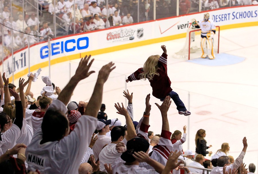 Read moreJustin Badlam (@jmbadlam) requested a photo of the "2012 NHL Stanley Cup playoffs." A young Phoenix Coyotes fan is tossed in the air as fans around her cheer on their team as Nashville Predators goalie Pekka Rinne, of Finland, stands in front of the goal during the third period of Game 1 in an NHL hockey Stanley Cup Western Conference semifinal playoff series, Friday, April 27, 2012, in Glendale, Arizona. The Coyotes won 4-3 in overtime. #