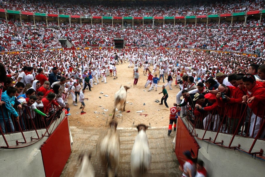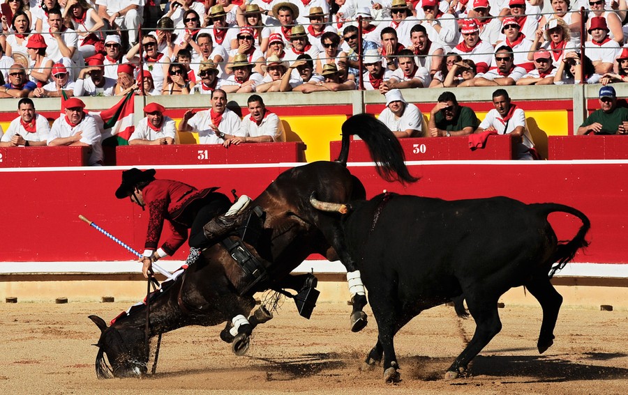 Every year, the Festival of San Fermin attracts thousands of visitors to Pamplona, Spain. Lasting nine days, the festival kicks off with massive crowds at the Chupinazo in Pamplona town square, followed by a carnival, fireworks, many bullfights, and of course, the encierro, or "running of the bulls." Held since 1591, San Fermin remains a popular, if also dangerous and controversial, event: Several people have been injured already this year, and the festival continues until July 14. Collected here are some scenes from the first days of this year's Festival of San Fermin.