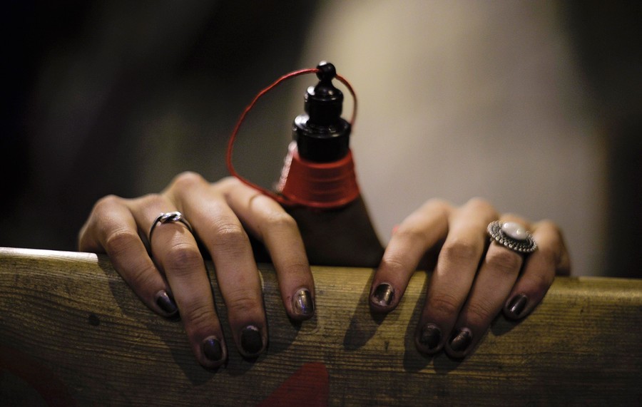 Read moreThe hands of a festival-goer hold her wineskin and railings as she waits for the start of the running of the bulls on the Estafeta corner, at the San Fermin fiestas, in Pamplona, on July 7, 2012. #