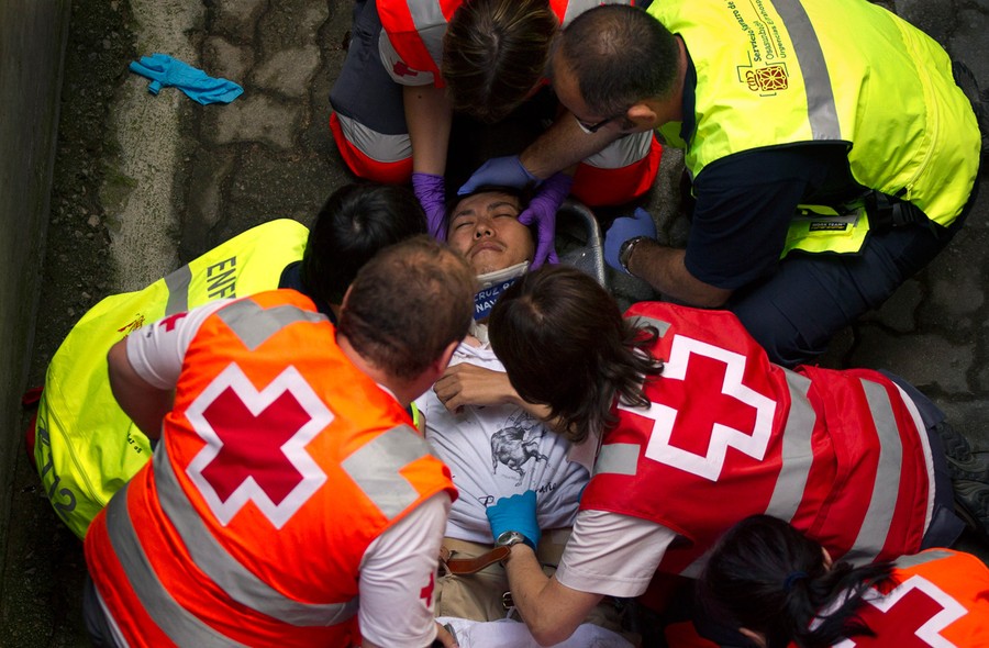 Read moreDoctors and paramedics give assistance to an injured man after a Dolores Aguirre Yabarra ranch fighting bull tossed him during the running of the bulls of the San Fermin festival, in Pamplona, on July 7, 2012. #