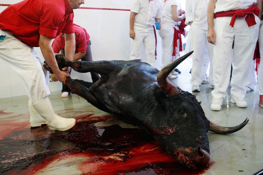 Read moreThe body of Navajito (Little Blade) is dragged away to be taken to the slaughterhouse following the second bullfight after being killed by Spanish bullfighter Javier Castano at the San Fermin festival in Pamplona, on July 8, 2012. The 640-kg (1,430 lbs) Miura fighting bull had earlier raced ahead of the pack of fellow bulls during Sunday morning's Running Of The Bulls, scattering runners in Estafeta Street and landing two in hospital. #