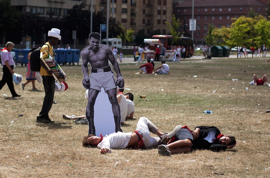 Read moreA placard depicting Muhammad Ali, left by street artists next to sleeping men in Cidadela Park during the second day of the San Fermin running of the bulls on July 8, 2012. #