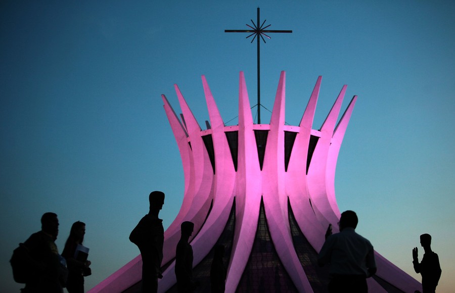 Read morePeople walk in front of the Cathedral of Brasilia, which is illuminated in pink to commemorate breast cancer awareness month in Brasilia, Brazil, on October 2, 2012. #