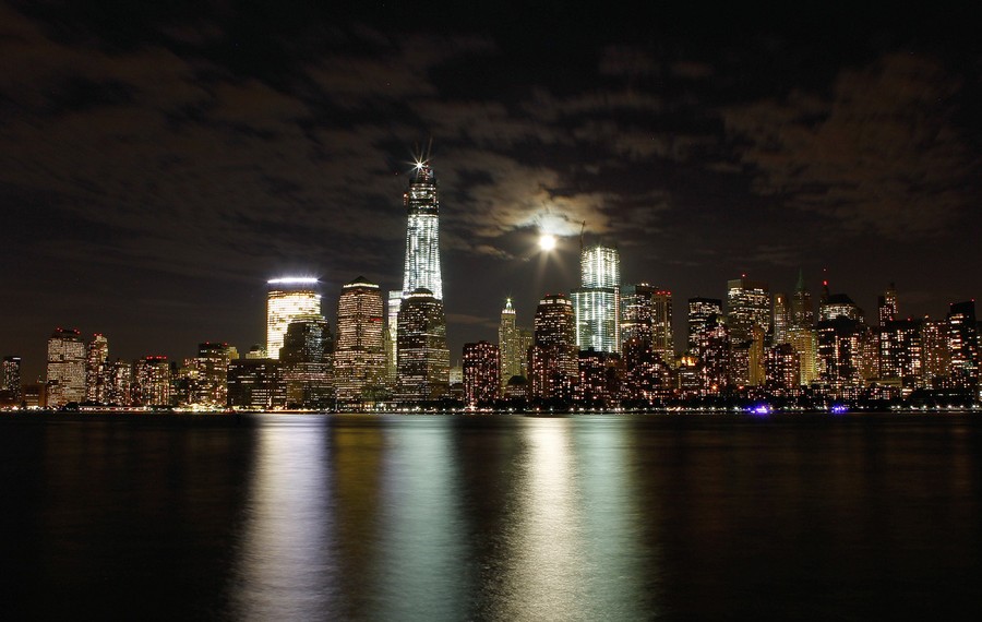 Read moreThe moon rises behind the skyline of New York's Lower Manhattan and One World Trade Center as lights are reflected on the Hudson River as seen from Jersey City, New Jersey, on October 1, 2012. #