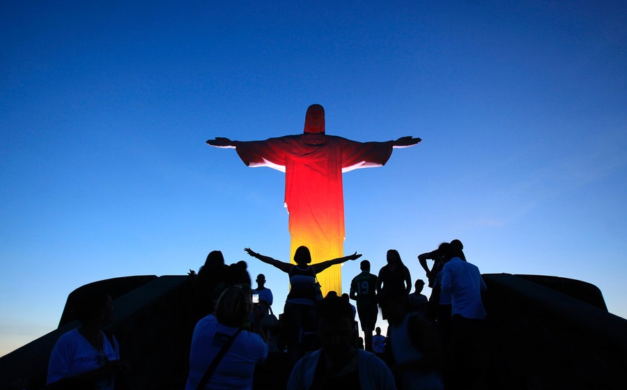 Read moreTourists take pictures in front of the Christ the Redeemer statue lit up in the colors of Germany's national flag in Rio de Janeiro, Brazil, on October 3, 2012. The lit statue celebrates the anniversary of the reunification of Germany, which was officially reunited on October 3, 1990. #