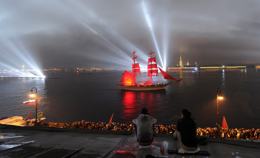 Read morePeople watch a tall ship on the Neva River in St. Petersburg, during the "Scarlet Sails," a romantic holiday with a light show to honor high schools graduates, on June 24, 2012. "Scarlet Sails" is the title of a story by Alexander Grin, the story of a young girl, who never gave up on her dreams and they finally arrived on the tall ship with the scarlet sails. #