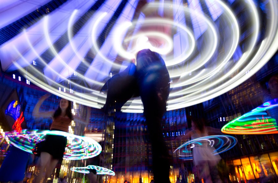 Read moreperformers spin their illuminated hula hoops during a flashmob in Potsdamer Platz in Berlin, Germany, on July 27, 2012. The flashmob was part of a three day festival "Hoopurbia", offering workshops, dance parties and performance showcases with hula hoops. #