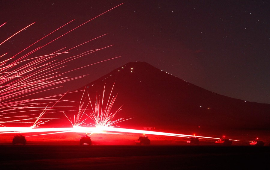 Read moreTracer bullets ricochet off their targets as Japanese Ground Self-Defence Force Type 74 and Type 90 armored tanks fire machine guns during a night training session at Higashifuji training field in Gotemba, west of Tokyo, on August 21, 2012. Mt. Fuji stands in the background. #