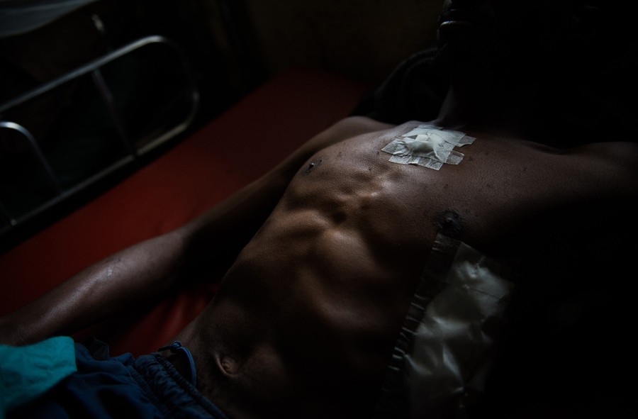 Read moreAn injured M23 rebel lies in a bed at the military hospital in Goma, on November 21, 2012 after being shot in the thorax during an M23 offensive in Kibumba, on November 15, and brought by military doctors to the hospital. The barracks were abandoned when government troops lost the city yesterday, leaving 52 casualties, 46 of whom were government soldiers. "All of our team remained during the clashes" said Dr. Ntumba Stephane, a military doctor. "We were not given the order to leave.". #